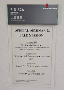 今回は、九州大学LL.M. 1期生(1995年卒業)、現在はアメリカで弁護士として活動されているRandal Murdockさんから、「Current US Government and the Law」というテーマでご講演頂きました。法学を学ぶ者として、大変興味深いお話を聞くことができました。